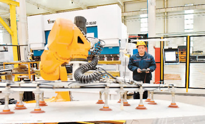 在河北省邢台市威县高新区的一家电力设备有限公司,工人在操控机械手臂作业。